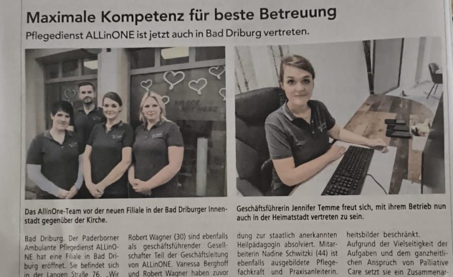 Pflegedienst ALLinONE ist jetzt auch in Bad Driburg vertreten.
